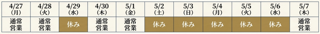 早速ですが、当社のゴールデンウィークのお休みについて、下記の通りご案内いたします。